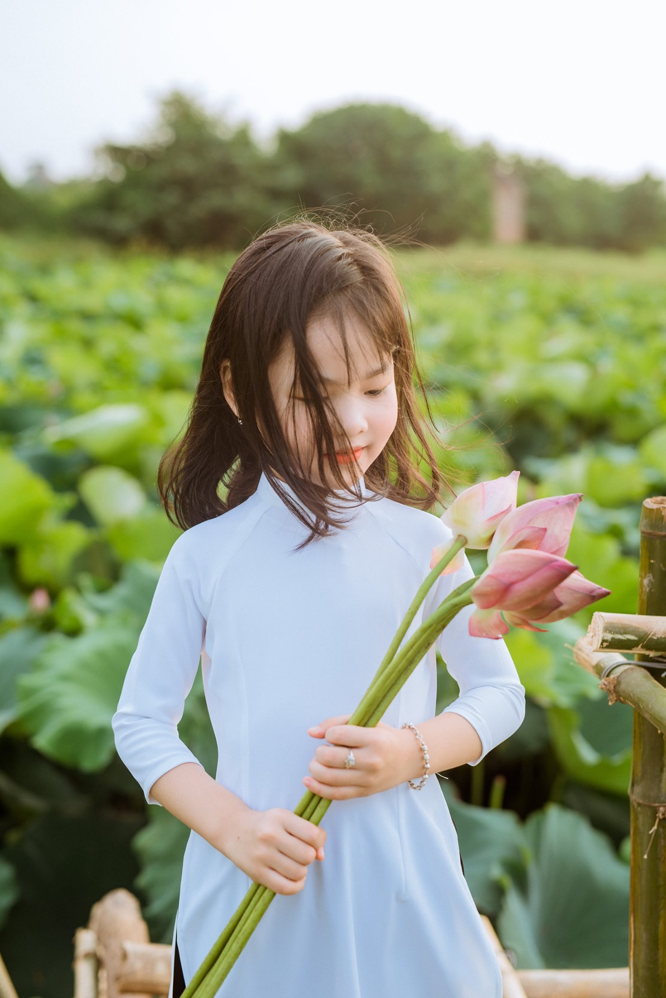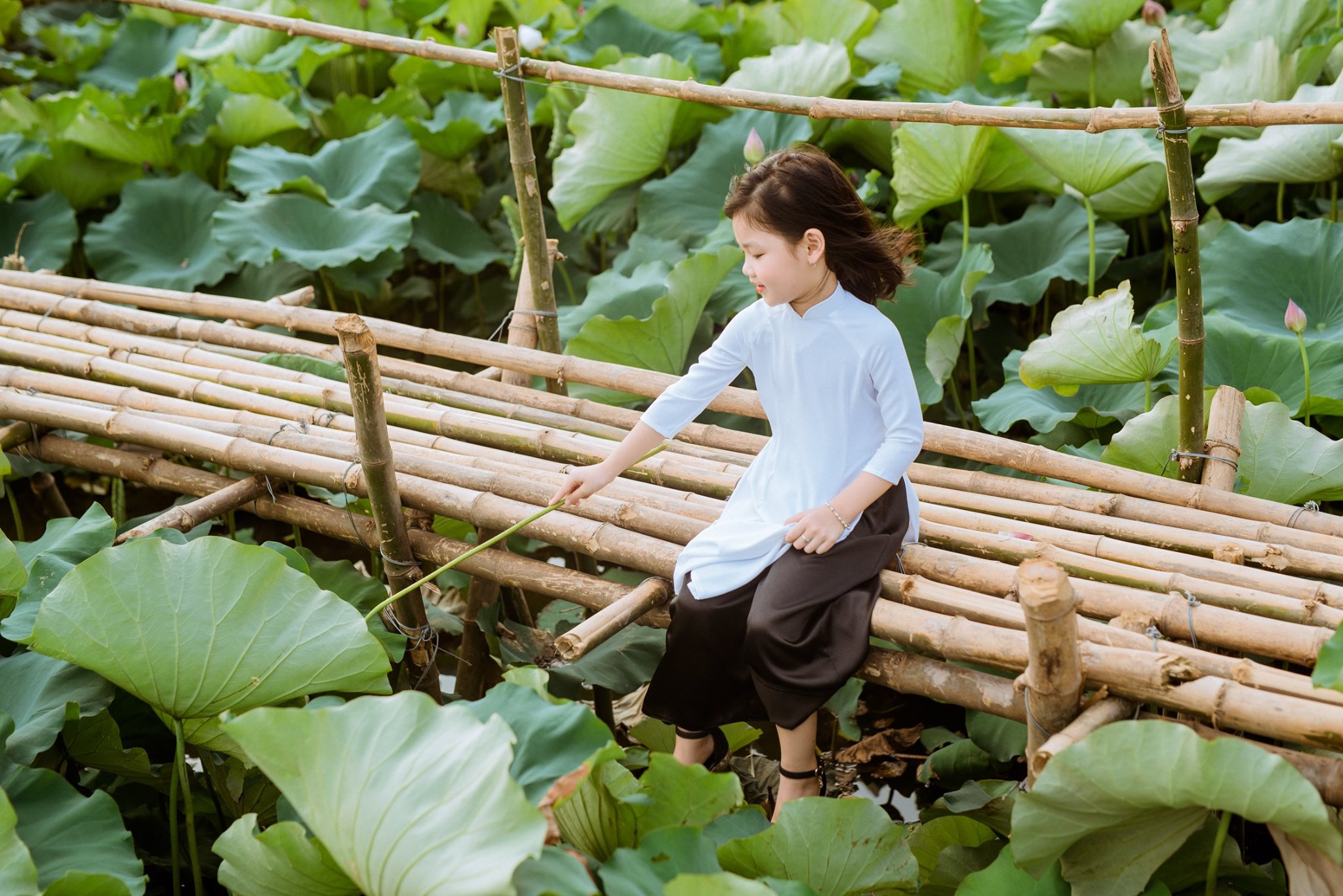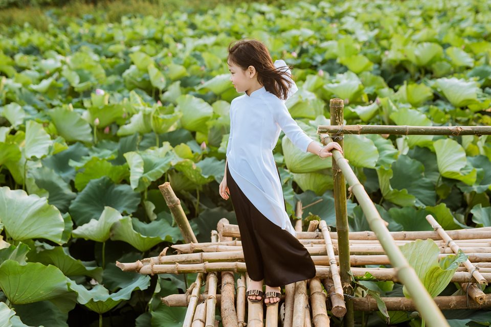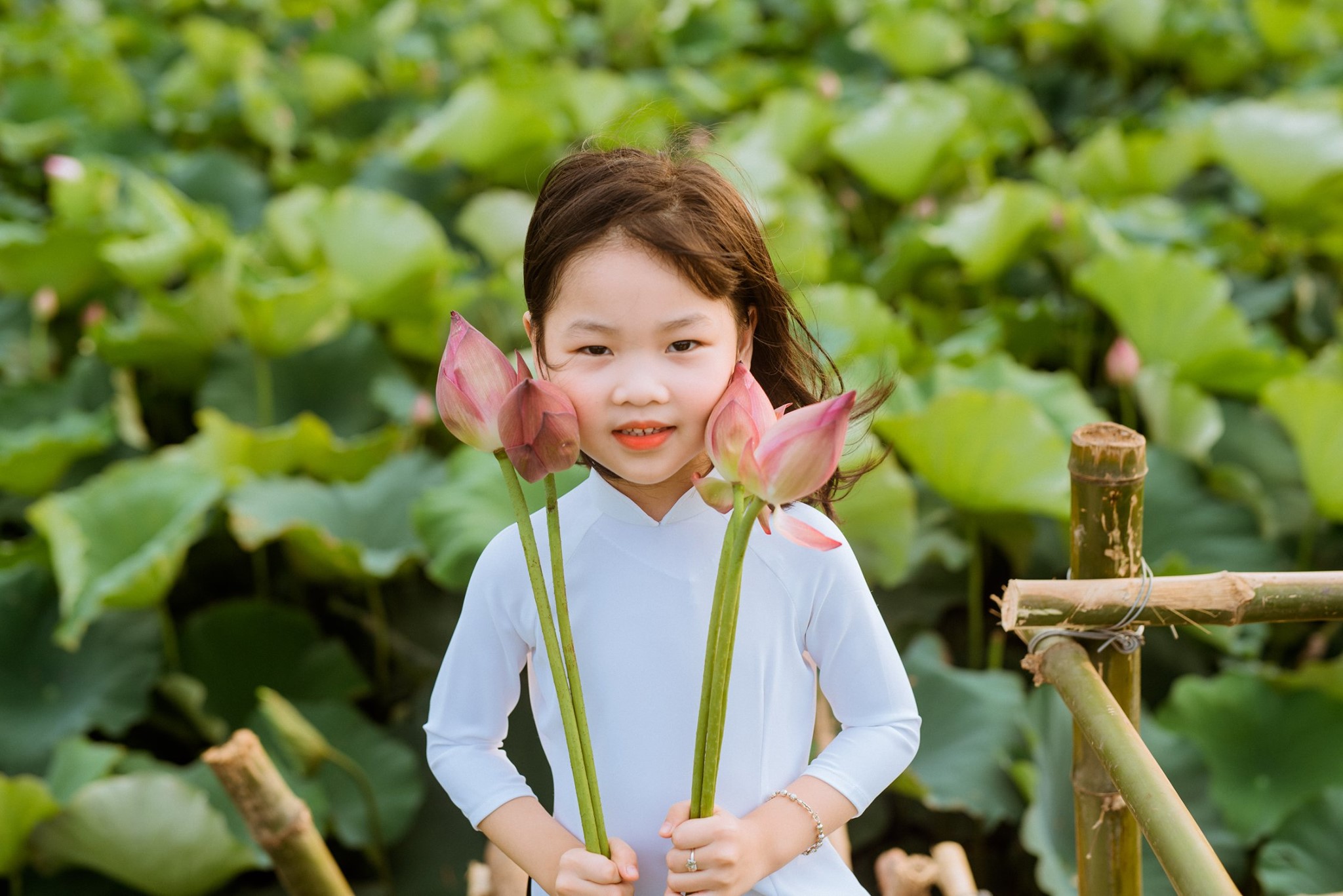 Các bé gái cũng xúng xính áo dài đi chụp hồ sen. Trong ảnh là cô con gái của nhiếp ảnh gia Bin Nguyễn.