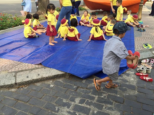Hình ảnh em bé nhặt rác theo mẹ xếp dép cho các bạn đồng trang lứa trong buổi dã ngoại. Ảnh: N.P