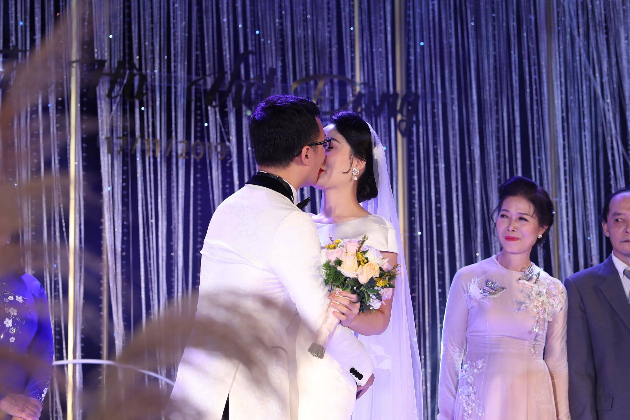 Cả hai trao nhau nụ hôn ngọt ngào trước sự chứng kiến của hai bên gia đình và chúc phúc của đông đảo bạn bè.