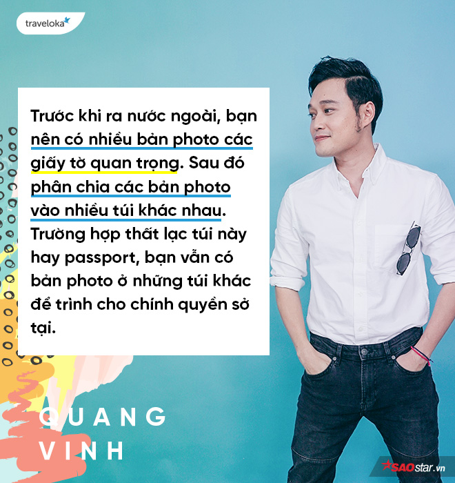 Còn đối với các giấy tờ tuỳ thân bản chính, Quang Vinh khuyên chúng ta không nên mang theo người mà có thể để passport trong két sắt phòng hay gửi lễ tân khách sạn là an toàn nhất.