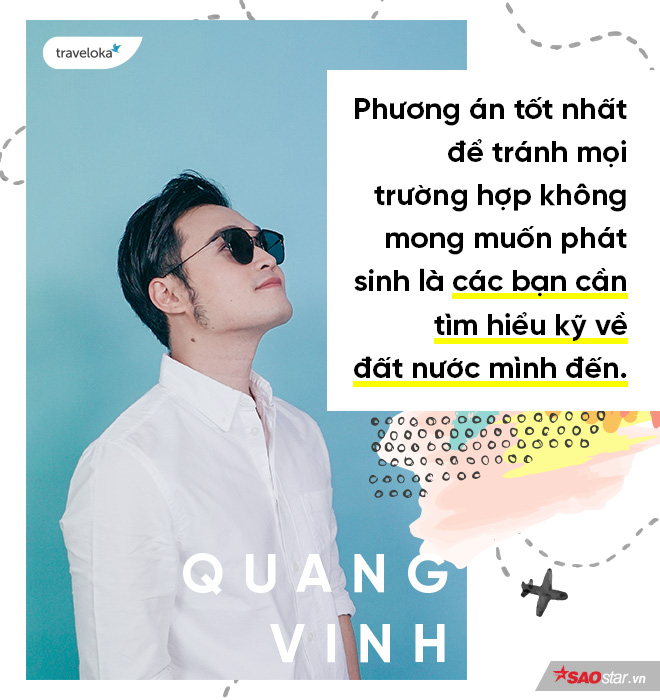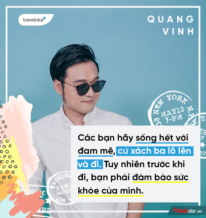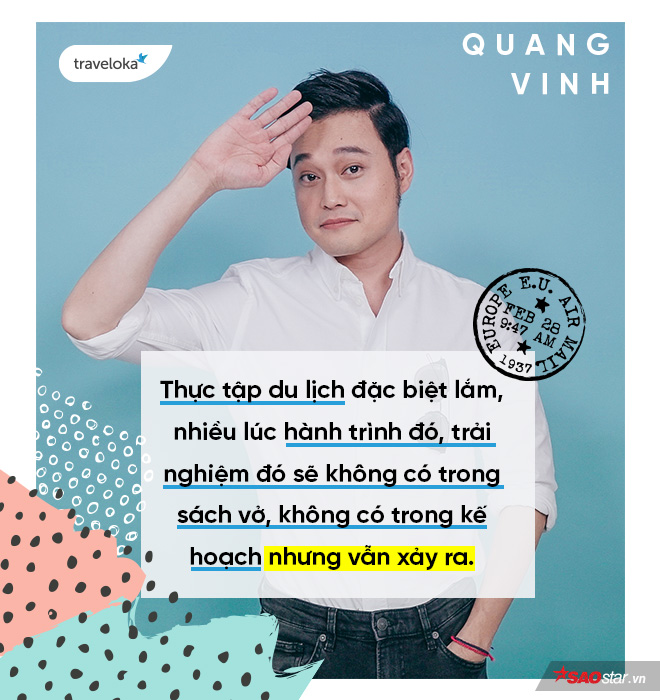 - Thực tập du lịch tưởng khó mà dễ, tưởng dễ mà khó. Thực tập du lịch đặc biệt lắm, nhiều lúc hành trình đó, trải nghiệm đó sẽ không có trong sách vở, không có trong kế hoạch nhưng vẫn xảy ra. Cho nên Quang Vinh khuyên các bạn hãy sống hết với đam mê, cứ xách ba lô lên và đi. Tuy nhiên trước khi đi, bạn phải đảm bảo sức khỏe của mình đang ở phong độ tốt nhất.