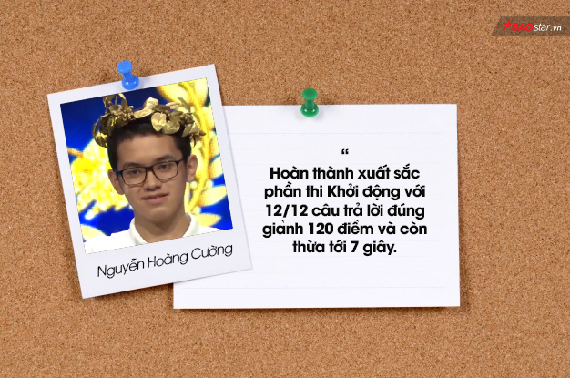 Mới đây nhất, trong chương trình “Đường lên đỉnh Olympia” tuần một, tháng hai, quý III của năm nay, thí sinh Nguyễn Hoàng Cường (THPT Hòn Gai, Quảng Ninh) đã hoàn thành xuất sắc phần thi Khởi động với 12/12 câu trả lời đúng (giành 120 điểm) và còn thừa tới 7 giây. Thành tích này đã khiến MC Ngọc Huy phải thốt lên: “Bạn đã phá kỷ lục trong 17 năm qua của Đường lên đỉnh Olympia”.