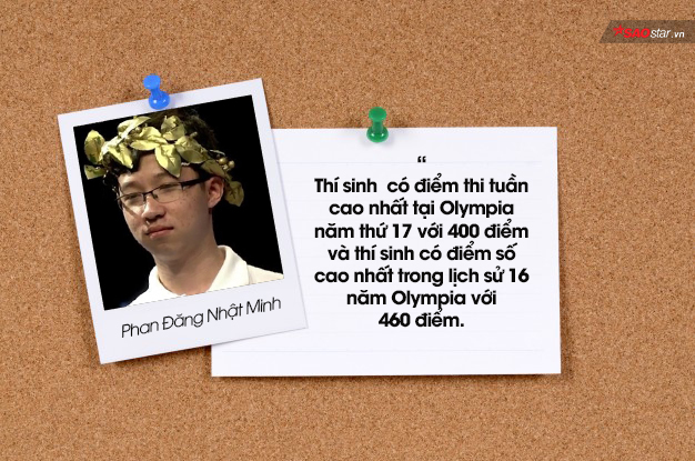 ”Cậu bé Google” Phan Đăng Nhật Minh chính là thí sinh đang giữ hai kỷ lục tại sân chơi này. Đó là thí sinh có điểm thi tuần cao nhất tại Olympia năm thứ 17 với 400 điểm và thí sinh có điểm số cao nhất trong lịch sử 16 năm Olympia với 460 điểm.