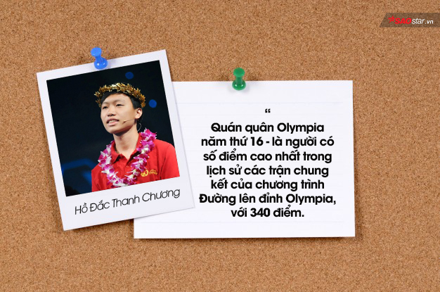 Hồ Đắc Thanh Chương (sinh năm 1999, THPT chuyên Quốc học Huế) - Quán quân Olympia năm thứ 16 - là người có số điểm cao nhất trong lịch sử các trận chung kết của chương trình Đường lên đỉnh Olympia, với 340 điểm.
