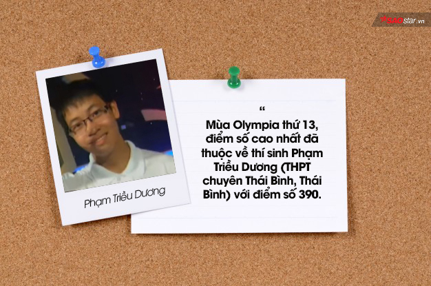 Mùa Olympia thứ 13, điểm số cao nhất đã thuộc về thí sinh Phạm Triều Dương (THPT chuyên Thái Bình, Thái Bình) với điểm số 390.