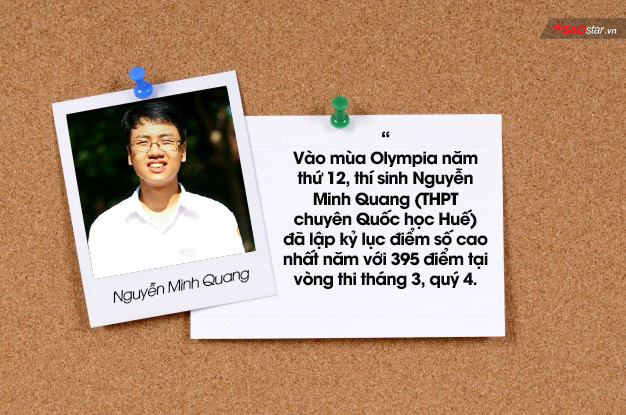 Vào mùa Olympia năm thứ 12, thí sinh Nguyễn Minh Quang (THPT chuyên Quốc học Huế) đã lập kỷ lục điểm số cao nhất năm với 395 điểm tại vòng thi tháng 3, quý 4.