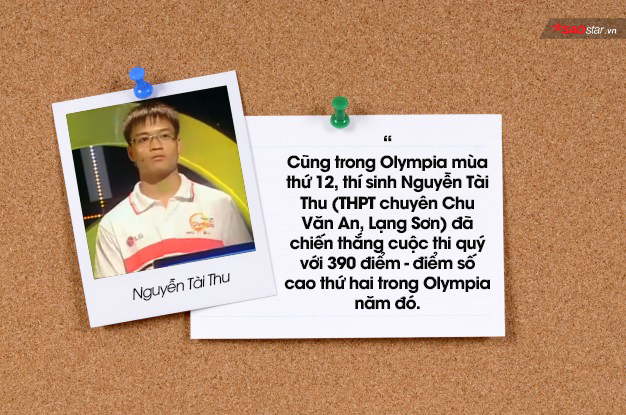 Cũng trong Olympia mùa thứ 12, thí sinh Nguyễn Tài Thu (THPT chuyên Chu Văn An, Lạng Sơn) đã chiến thắng cuộc thi quý với 390 điểm - điểm số cao thứ hai trong Olympia năm đó.