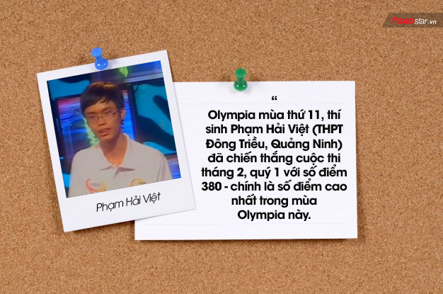 Còn trong Olympia mùa thứ 11, thí sinh Phạm Hải Việt (THPT Đông Triều, Quảng Ninh) đã chiến thắng cuộc thi tháng 2, quý 1 với số điểm 380 - chính là số điểm cao nhất trong mùa Olympia này.