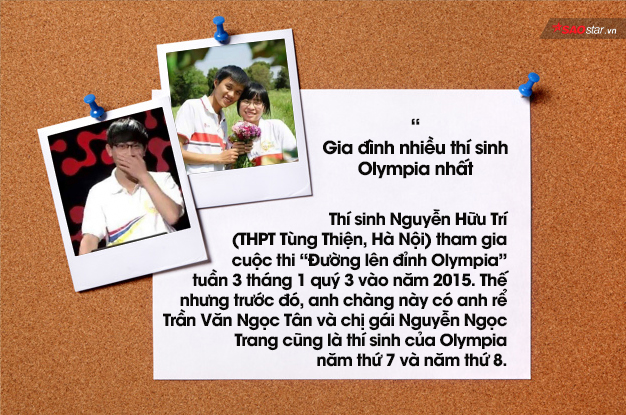 Một kỷ lục thú vị khác trong lịch sử Olympia chính là ”Gia đình có nhiều thí sinh Olympia nhất”. Thí sinh Nguyễn Hữu Trí (học sinh trường THPT Tùng Thiện, Hà Nội) tham gia cuộc thi “Đường lên đỉnh Olympia” tuần 3 tháng 1 quý 3 vào năm 2015. Thế nhưng trước đó, anh chàng này có anh rể Trần Văn Ngọc Tân và chị gái Nguyễn Ngọc Trang cũng là thí sinh của Olympia năm thứ 7 và năm thứ 8.