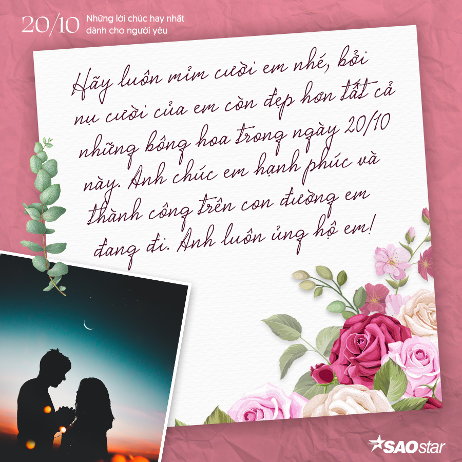 - Hãy luôn mỉm cười em nhé, bởi nụ cười của em còn đẹp hơn tất cả những bông hoa trong ngày 20/10 này. Anh chúc em hạnh phúc và thành công trên con đường em đang đi. Anh luôn ủng hộ em!