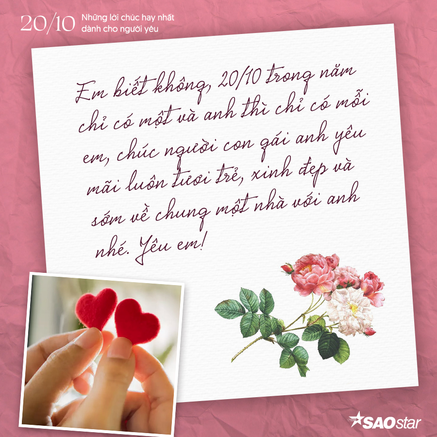 - Em biết không, 20/10 trong năm chỉ có một và anh thì chỉ có mỗi em, chúc người con gái anh yêu mãi luôn tươi trẻ, xinh đẹp và sớm về chung một nhà với anh nhé. Yêu em!