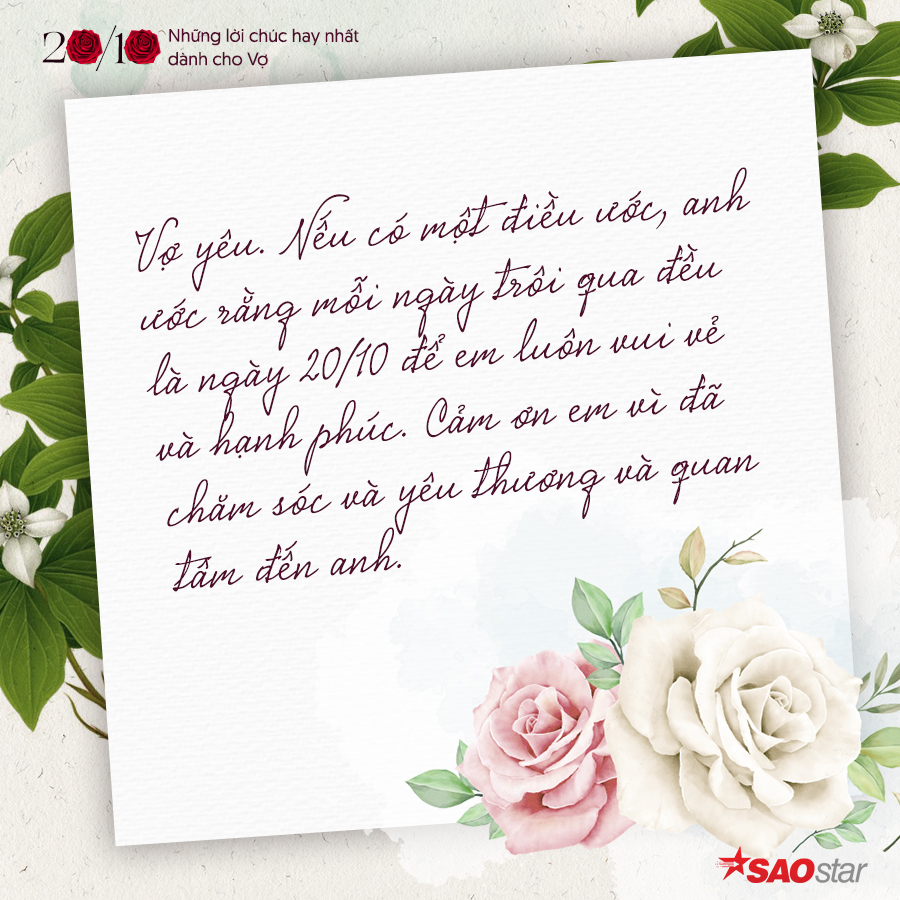 - Vợ yêu. Nếu có một điều ước, anh ước rằng mỗi ngày trôi qua đều là ngày 20/10 để em luôn vui vẻ và hạnh phúc. Cảm ơn em vì đã chăm sóc và yêu thương và quan tâm đến anh.
