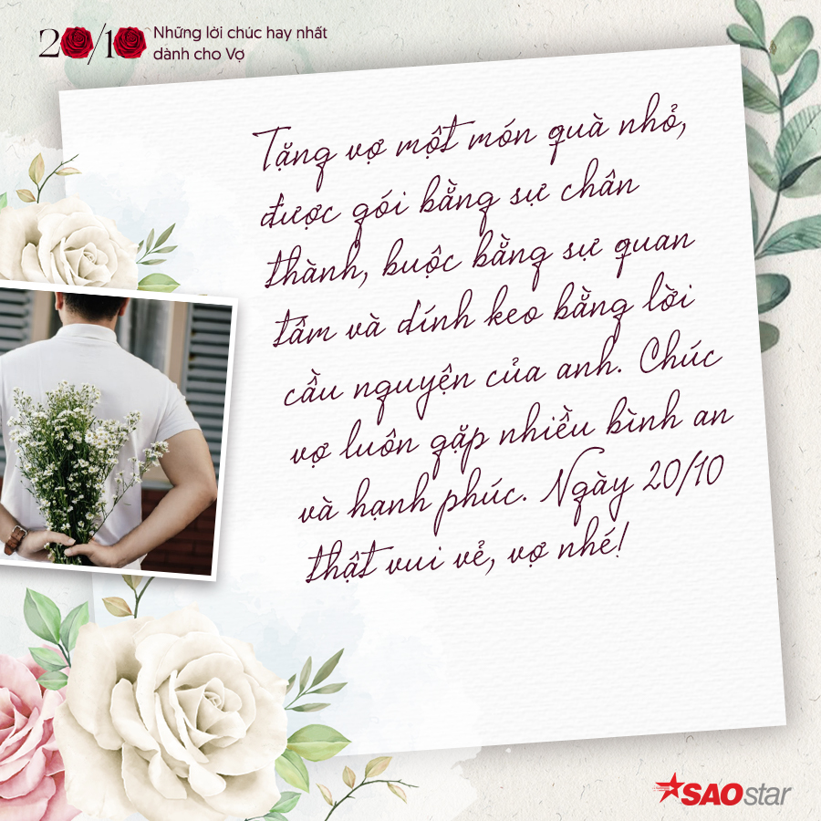 - Tặng vợ một món quà nhỏ, được gói bằng sự chân thành, buộc bằng sự quan tâm và dính keo bằng lời cầu nguyện của anh. Chúc vợ luôn gặp nhiều bình an và hạnh phúc. Ngày 20/10 thật vui vẻ, vợ nhé!
