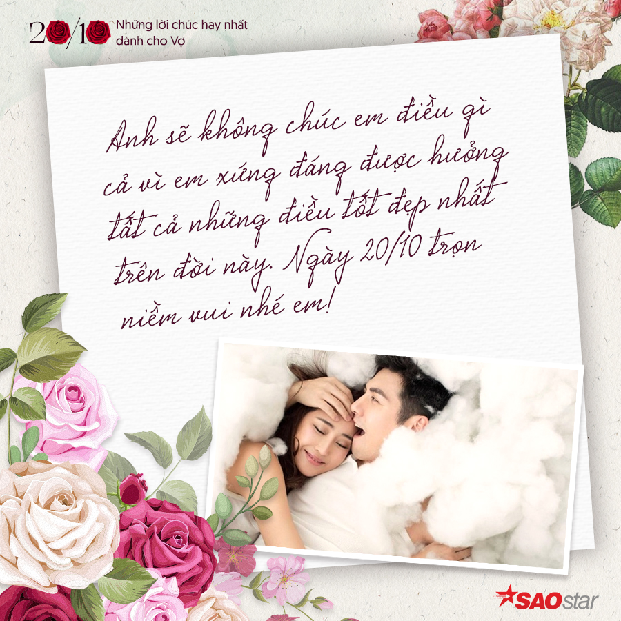 - Anh thật sự là người đàn ông may mắn nhất thế gian khi có vợ ở bên, luôn chăm sóc và ân cần mọi lúc. Chúc vợ có một ngày 20/10 thật ý nghĩa và hạnh phúc. Anh sẽ luôn cố gắng vì em, vì hạnh phúc của chúng ta. Yêu vợ rất nhiều.