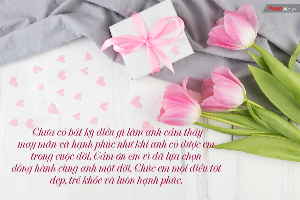 Chưa có bất kỳ điều gì làm anh cảm thấy may mắn và hạnh phúc như khi anh có được em trong cuộc đời. Cảm ơn em vì đã lựa chọn đồng hành cùng anh một đời. Chúc em mọi điều tốt đẹp, trẻ khỏe và luôn hạnh phúc.