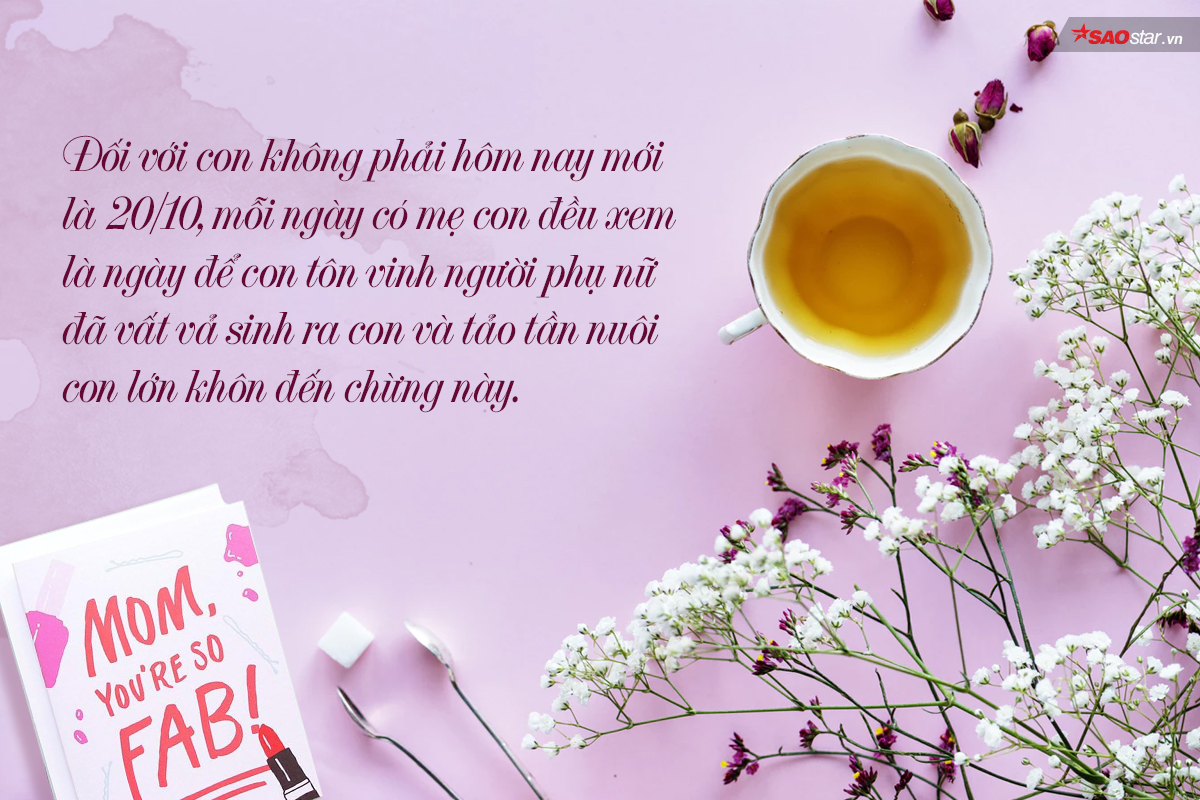 Đối với con không phải hôm nay mới là 20/10, mỗi ngày có mẹ con đều xem là ngày để con tôn vinh người phụ nữ đã vất vả sinh ra con và tảo tần nuôi con lớn khôn đến chừng này.