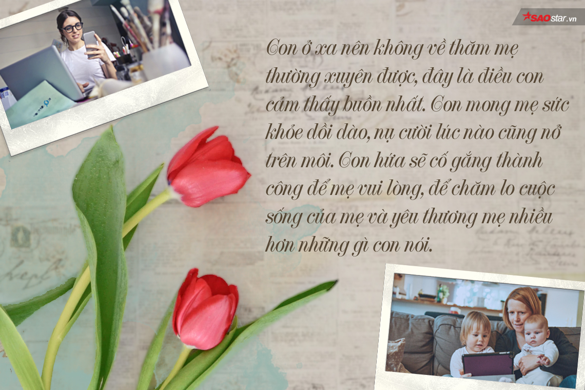 Con ở xa nên không về thăm mẹ thường xuyên được, đây là điều con cảm thấy buồn nhất. Con mong mẹ sức khỏe dồi dào, nụ cười lúc nào cũng nở trên môi.