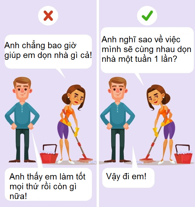 Cố gắng tránh những cụm từ có ý khái quát hóa như “luôn luôn”, “không bao giờ” và “liên tục” khi trách mắng đối phương. Để giải quyết tốt vấn đề này, bạn nên bày tỏ cảm xúc cá nhân và cùng nhau tìm kiếm giải pháp cho vấn đề. Mọi việc sẽ nhanh chóng ổn thỏa!