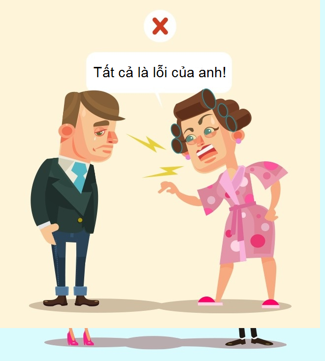“Tất cả là lỗi của anh!”, “Vì anh mà giờ mình mới như vậy! là những câu nói điển hình. Những lời nói này chẳng những không giải quyết được vấn đề mà còn làm mọi chuyện thêm nghiêm trọng hơn rất nhiều!