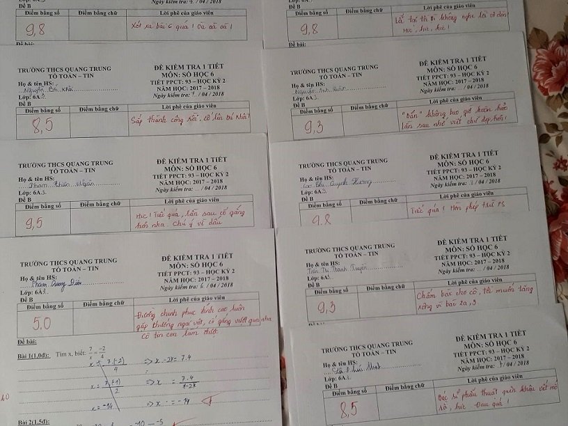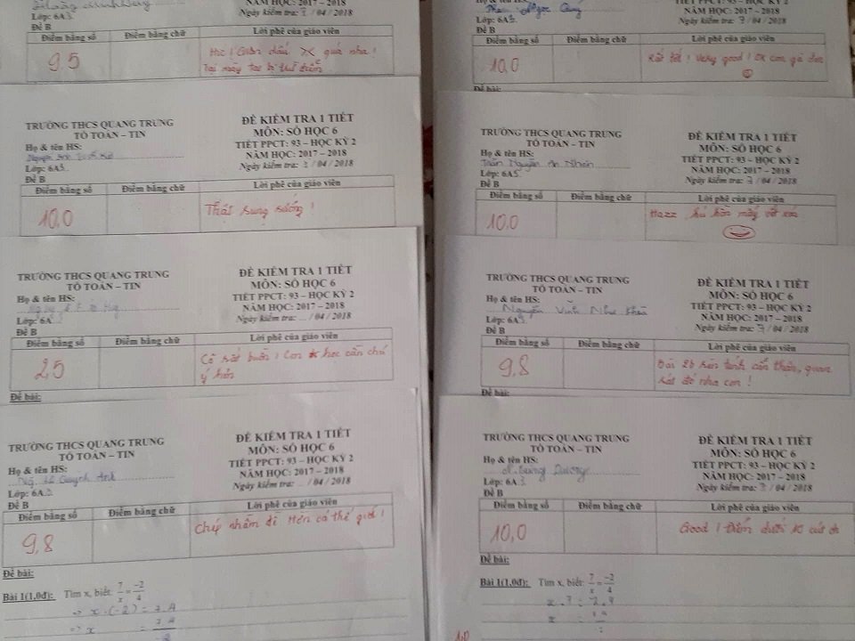 Không chỉ có điểm số hay những dòng lời phê cụt lủn, những bài kiểm tra từ cô giáo Huyền luôn kèm theo những dòng nhận xét ấn tượng, đầy cảm xúc và pha cả chút hài hước.