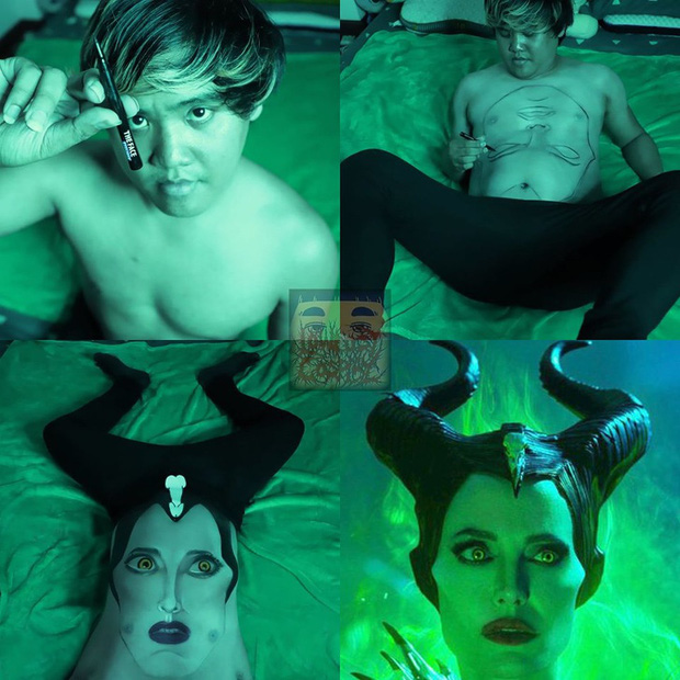 Chỉ cần 1 cây bút, anh chàng đã biến thành Maleficient với cặp sừng là đôi chân của mình.
