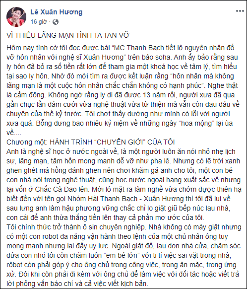 Cứ ngỡ mọi ồn ào của cuộc hôn nhân này đã lui về quá khứ, ấy vậy mà sau 13 năm ly hôn, mới đây trên một chương trình MC Thanh Bạch bất ngờ chia sẻ lý do chia tay NS Xuân Hương năm ấy là do cuộc sống vợ chồng không lãng mạn, thường cãi vã dẫn đến rạn nứt tình cảm.