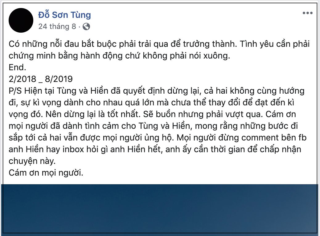 Dân tình cũng lội lại status thông báo chuyện tình yêu của họ đã kết thúc vào tháng 08 vừa qua. Nhiều người đánh giá cả hai đã có một quãng thời gian yêu nhau - dù ngắn ngủi - nhưng rất văn minh và chân thành.