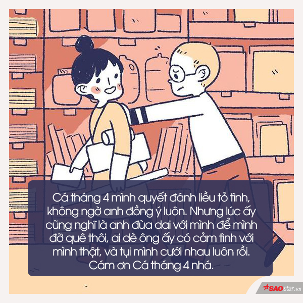 6. “Chuyện của mình vào Cá tháng tư lại có kết cục viên mãn đến không ngờ. Mình thích crush từ lâu nhưng ngại chả nói, bởi nghĩ không xứng với anh. Được bọn bạn bày cho, Cá tháng 4 mình quyết đánh liều tỏ tình, không ngờ anh đồng ý luôn. Nhưng lúc ấy cũng nghĩ là anh đùa dai với mình để mình đỡ quê thôi, ai dè ông ấy có cảm tình với mình thật và tụi mình cưới nhau luôn rồi. Cám ơn Cá tháng 4 nhá, nhờ có ngày này mới hết ế”, chắc đây là cô nàng may mắn nhất câu được cá to ngày Cá tháng Tư rồi.