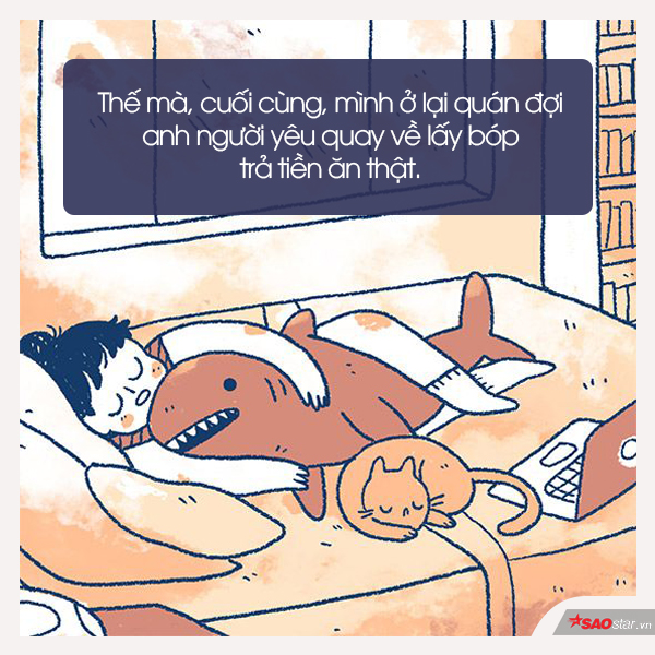8. “Đi ăn với anh người yêu mình chả bao giờ phải mang tiền, chả hiểu ông ấy có cố tình không lại bảo mình, anh quên mang ví, em cầm tiền cho anh mượn đỡ, hôm sau anh gửi ngay 1/4. Mình đồng ý luôn nhưng cũng đi ăn với chiếc túi không. Tưởng lừa bà mà dễ à. Thế mà, cuối cùng, mình ở lại quán đợi anh người yêu quay về lấy bóp trả tiền ăn thật. Sau vụ đấy, ông dỗi mình gần tuần luôn”.