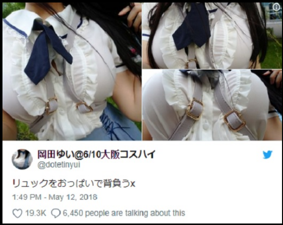 Mới đây, một cosplayer nổi tiếng đến từ Nhật Bản có tên Yui Okada đã trở thành tâm điểm của Twitter khi mở màn trào lưu ”Khoe vòng 1 bằng dây balo”. Với lợi thế là vòng 1 đẫy đà, nữ cosplayer này đã có một màn khoe vòng 1 rất ấn tượng khi đeo balo và kéo dây balo sát vào giữa hai ngực.