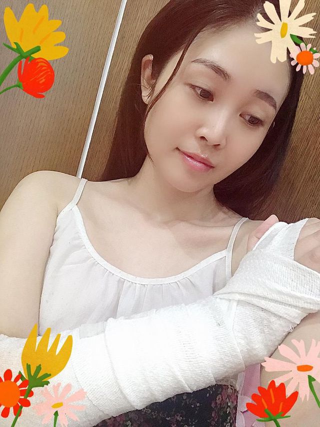 Thùy Linh cho biết cánh tay phải đang băng bó do gặp tai nạn. Ảnh: FBNV.