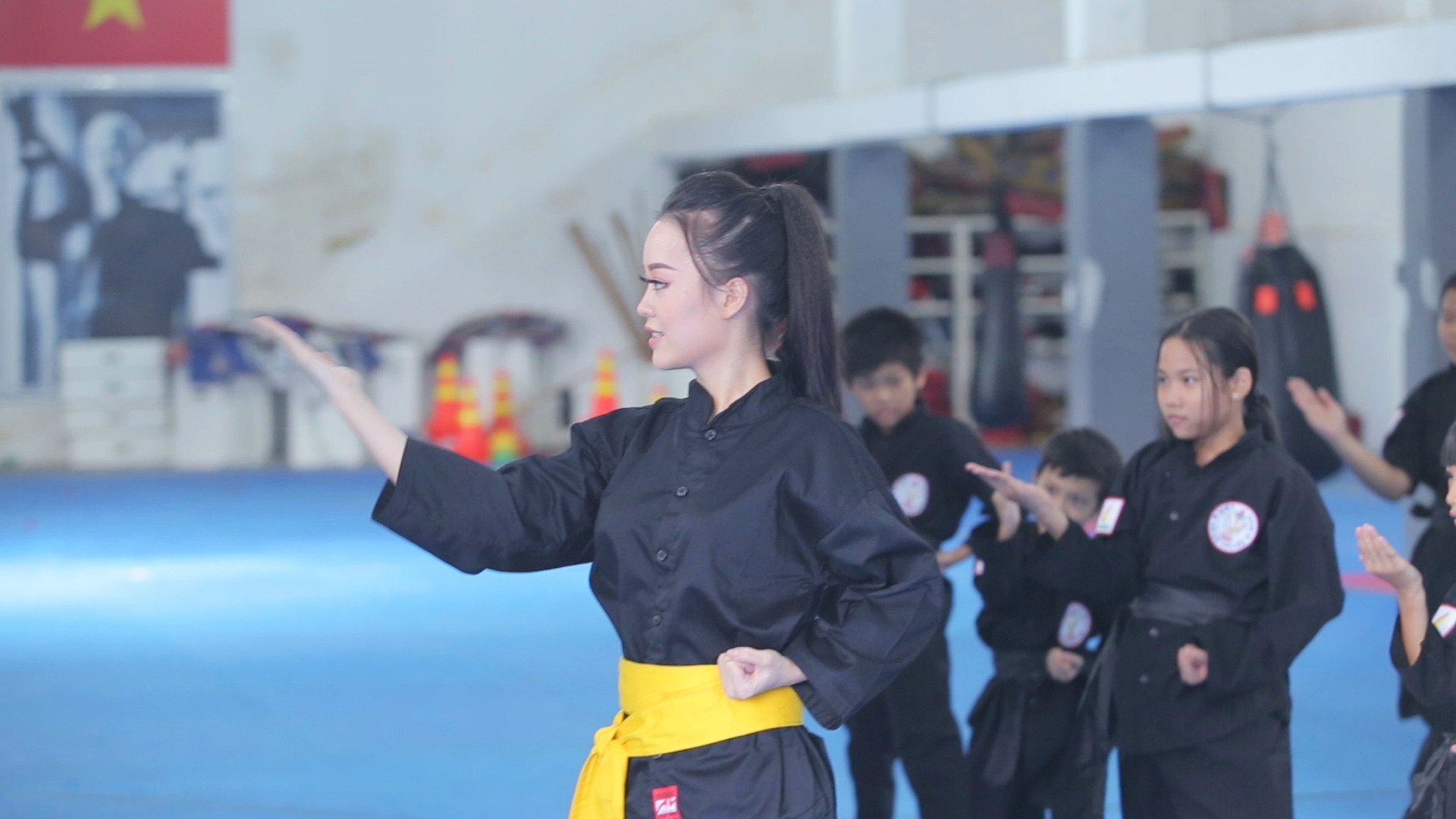 Thu dạy võ cho các em nhỏ.