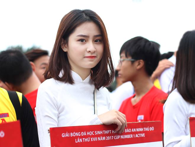 Thì ra, cô nàng này là Trần Khánh Linh, sinh năm 2000, học sinh lớp 12A2 trường THPT Huỳnh Thúc Kháng - Hà Nội. Hình ảnh chụp Khánh Linh hôm đó là ngày cô đại diện nữ sinh của trường, tới buổi lễ khai mạc Giải bóng đá học sinh các trường THPT Hà Nội để cầm biển cho đội tuyển.