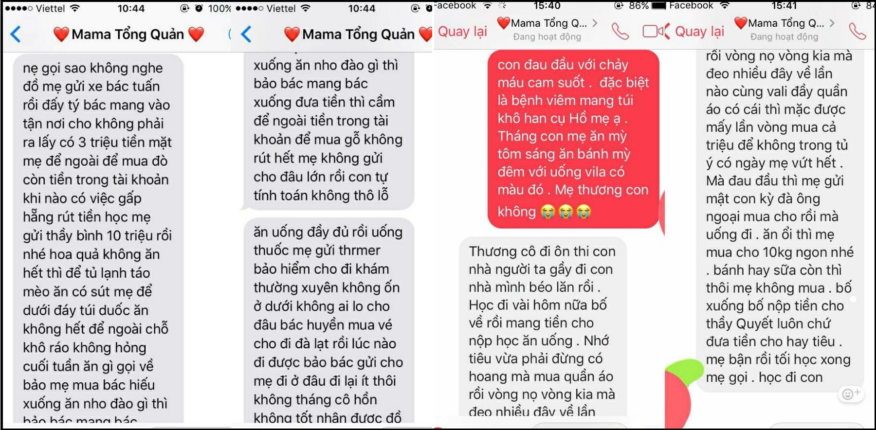 “Thương cô đi ôn thi, con nhà người ta gầy đi, con nhà mình béo lên. Rồi, học đi, vài hôm nữa bố về rồi mang tiền cho nộp học, ăn uống. Nhớ tiêu vừa phải, đừng có hoang mà mua quần áo rồi vòng nọ vòng kia, đeo đây về đây. Lần nào cũng va li đầy quần áo, có cái thì mặc được mấy lần. Vòng mua cả triệu để không trong tủ ý, có ngày mẹ vứt hết. Đau đầu thì mẹ gửi mật con kỳ đà ông ngoại mua cho rồi mà uống đi. Ăn ổi thì mẹ mua cho 10kg ngon nhé. Bánh hay sữa còn thì thôi mẹ không mua nữa. Bố xuống bố nộp tiền cho thầy Quyết luôn chứ đưa tiền cho hay tiêu. Mẹ bận rồi, tối học xong mẹ gọi, học đi con”.