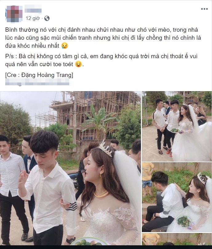 “Bình thường nó với chị đánh nhau chửi nhau như chó với mèo, trong nhà lúc nào cũng sặc mùi chiến tranh nhưng khi chị đi lấy chồng thì nó chính là đứa khóc nhiều nhất.
