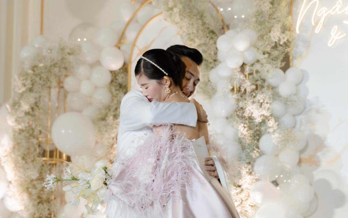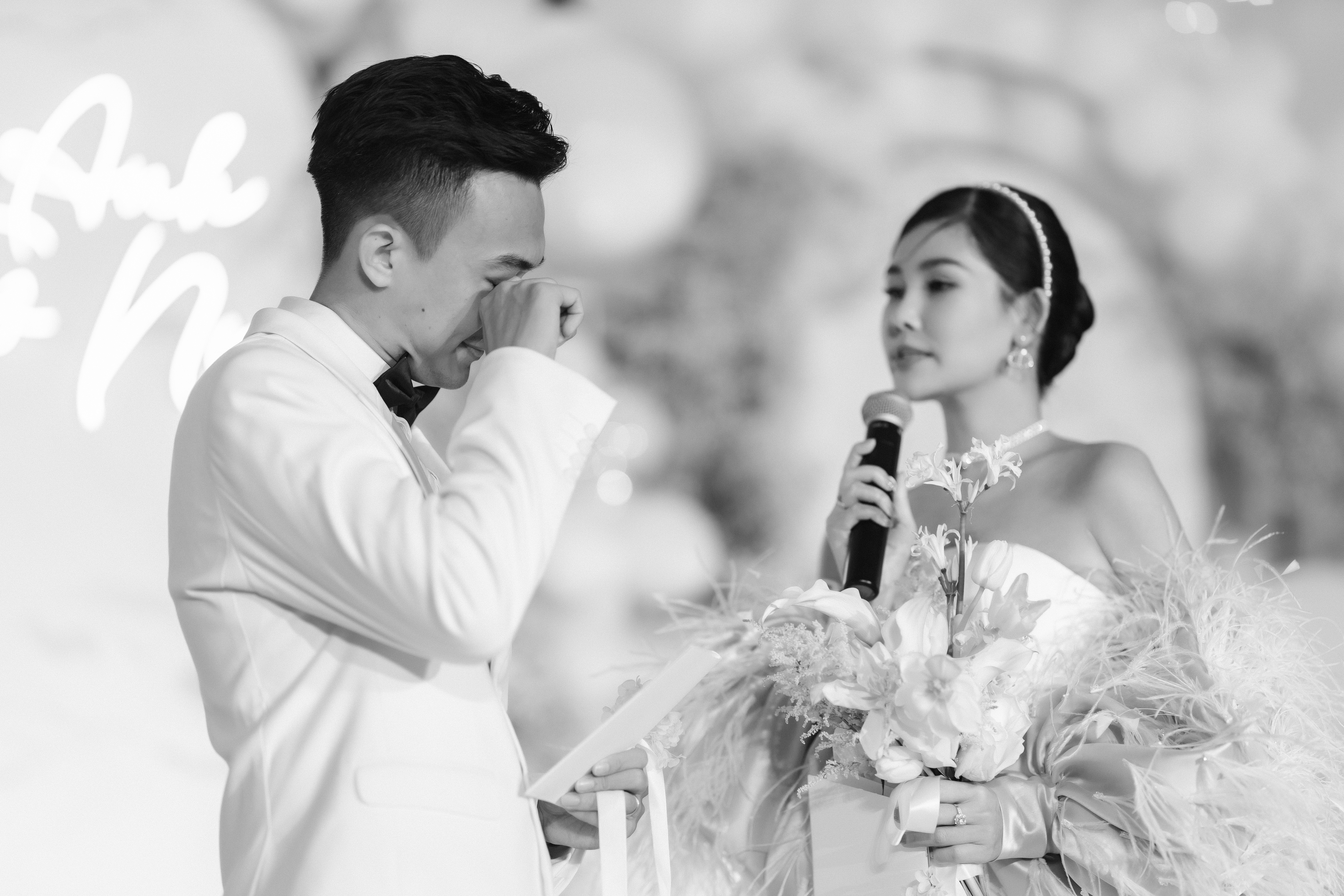 Trong buổi lễ hoành tráng, ấm áp trong sự chứng kiến của nhiều người thân thiết. Chú rể Phan Tô Ny xúc động chia sẻ: "Có 2 câu chuyện khiến Ny muốn ở cạnh cô gái này. Thứ nhất, khi tôi hỏi Ngân Anh sợ nhất điều gì. Cô ấy nói sợ bị bắt nạt trên mạng. Thứ hai, Ngân Anh cho tôi xem 1 email, viết rằng có hai vợ chồng cô chú ở Hà Nội, những người học bách khoa như bố em.