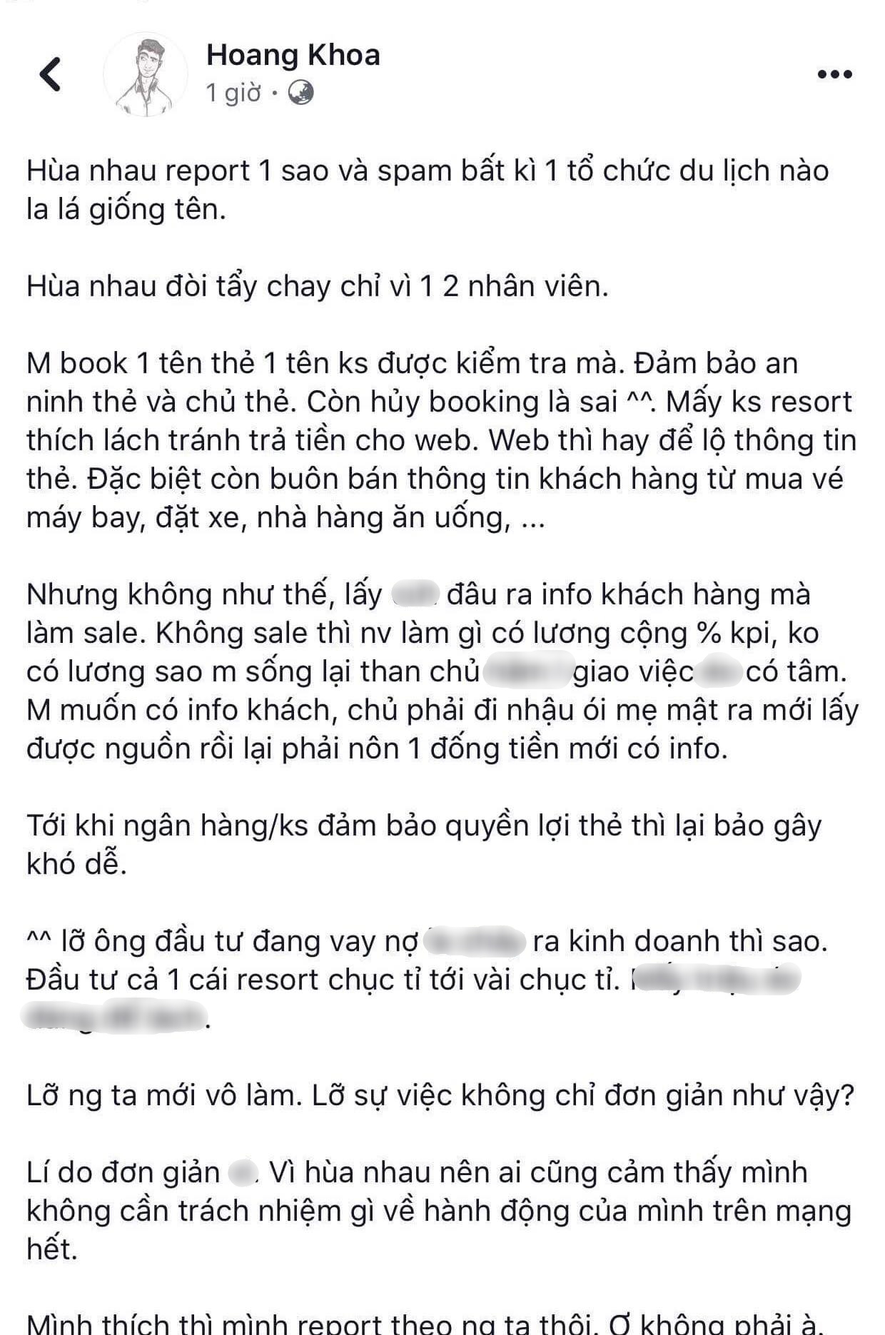 Mình muốn gửi lời xin lỗi tới anh Khoa Pug. Status của mình không hề có ý đả kích, nói kháy, khích bác anh ấy gì cả. Trong bài viết của mình, mình có nói về những resort na ná tên bị đánh 1 sao, gia đình của chị tiếp tân sau đó thì sao, nhưng nhiều người đã cố tình cắt xén, lái sang chuyện là mình bảo vệ cái resort đó.