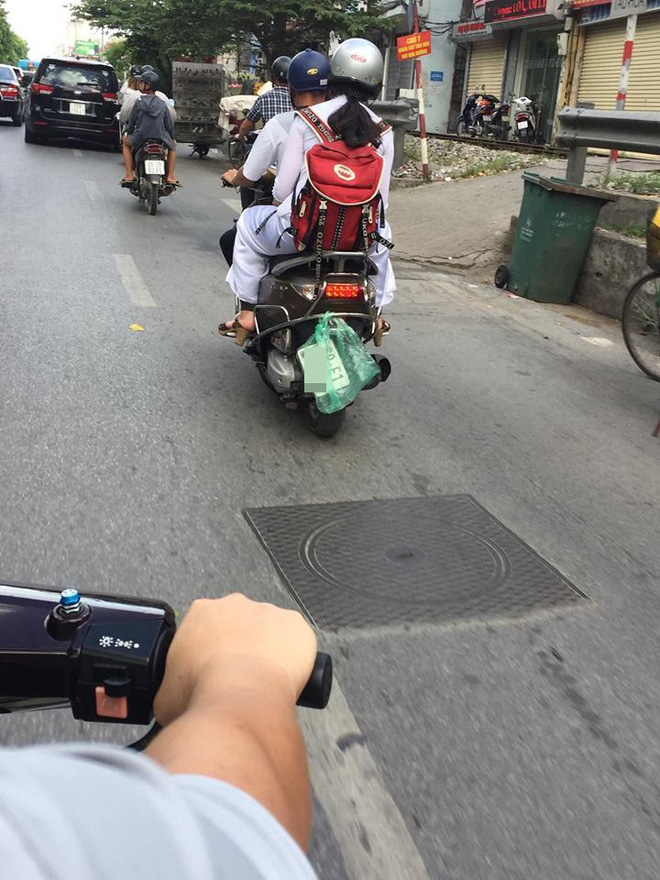 Nhưng không cần lo lắng, anh này đã nhanh trí tìm ra giải pháp mang ý nghĩa “một công đôi việc”. Để chấp hành đúng luật giao thông, đồng thời để xe khỏi bị bắn nước bẩn nên thiếu nữ mặc áo dài trắng phía sau, anh đã cho biển số vào một chiếc túi nilon cột ngay đuôi xe.