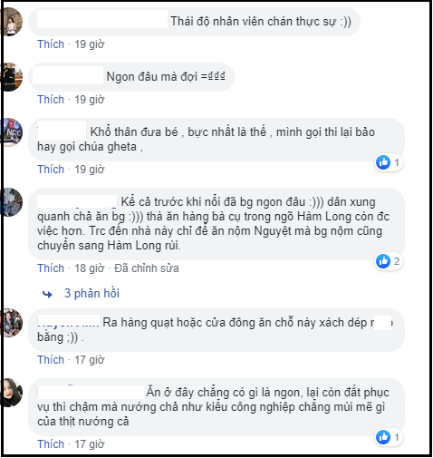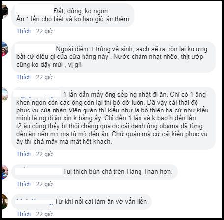 Nhat Ha Nguyen: ”Em nói thật. Riêng quán này mà ai khen thì phải xem xét nghiêm túc lại khẩu vị của người đấy. Mắm nhạt nhẽo, thịt thì tanh, không có cái vị gì của tẩm ướp hay thơm mùi nướng cả. Nem thì như kiểu cho người mới xuống núi ăn. Ú ụ. Chán không thể nuốt nổi miếng thứ 2. Khổ thân khách du lịch. Ăn xong sẽ có nhận định sai lệch về hương vị món bún chả. Bún chả không thể có cái hương vị như quán này bán”.