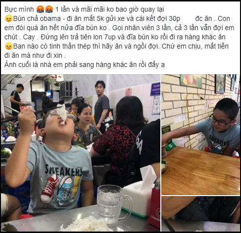 Mới đây, một ông bố đã khá bức xúc đăng tải một review ngắn về trải nghiệm không mấy tốt đẹp khi anh đưa gia đình đến ăn quán này. Cụ thể, anh và gia đình ngồi chờ 30 phút nhưng không thấy đồ ăn ra, kêu nhân viên đến 3 lần cũng vẫn là 'Đợi em chút”. Cậu bé con anh vì đói quá đành phải ăn hết nửa dĩa bún không. Cuối cùng, anh và gia đình phải tính tiền lon nước ngọt và dĩa bún rồi sang hàng khác ăn. Cuối bài viết, người này còn khẳng định sẽ ”cạch đến già” quán bún chả này.