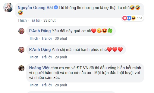 Không còn tránh tương tác trên mạng xã hội, ngay sau khi Nhật Lê chia sẻ bài đăng, “quả bóng vàng” Quang Hải đã lập tức bình luận dưới bức hình: “Dù không tin nhưng nó là sự thật Lu nhé” và nhận được rất nhiều lượt quan tâm, bày tỏ cảm xúc từ dân mạng.