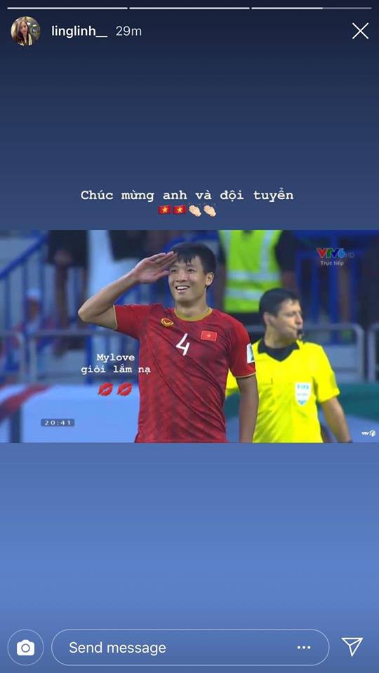 Sau trận đấu, bạn gái Nguyễn Khánh Linh của trung vệ Bùi Tiến Dũng cũng không quên gửi lời chúc mừng tới người yêu. Cô nàng đăng tải dòng story hình ảnh giơ cao tay chào kiểu quân đội của người yêu sau chiến thắng lượt luân lưu cùng dòng trạng thái “Chúc mừng anh và đội tuyển”.