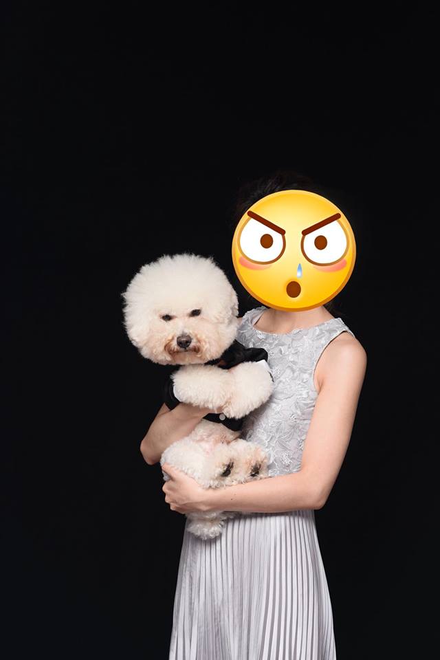 Tài khoản H.T “than thở”: “Mình muốn đấm chết nó (chú chó tên Bon) quá! Mình cho đi trang điểm, nó làm tóc lâu hơn cả mình. Trong khi bố mẹ mải diễn ôm hôn nhau, nó đợi lâu quá đến lúc gọi vào thì mặt sưng lên, hằm hằm như thịt bằm nấu đông thế này! Còn gì là bộ ảnh, cay quá!“.