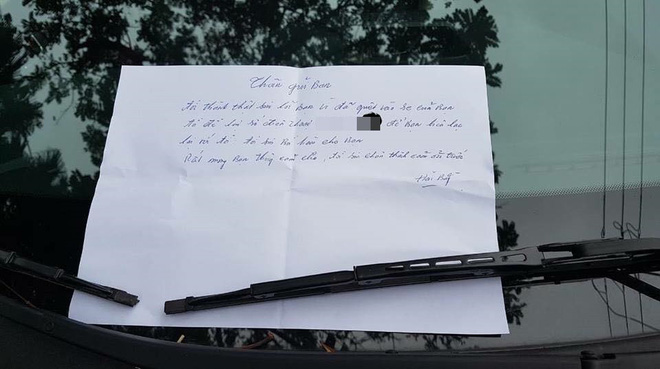 Cụ thể, người đã làm xước chiếc ô tô đã viết: “Thân gửi bạn. Tôi thành thật xin lỗi vì đã va quệt vào xe của bạn. Tôi để lại số điện thoại *** để bạn liên lạc lại với tôi. Tôi sẽ bồi thường cho bạn. Rất mong bạn thông cảm cho tôi…“, nội dung mảnh giấy nhắn.