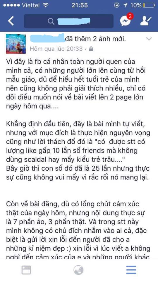 L.A thừa nhận, ”thành công” đó thực sự không vui vì mang lại quá nhiều rắc rối cho cậu. Thậm chí, bài đăng còn có nội dung ảo hết 7 phần, chỉ có 3 phần thật. Cuối cùng, cậu gửi lời xin lỗi đến ”người đã cho anh kỷ niệm đẹp” và mong những người bạn sẽ có cái nhìn khách quan hơn.