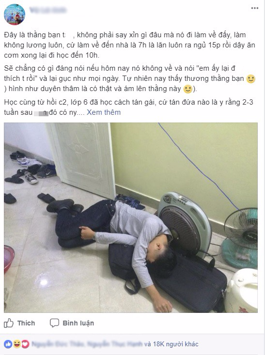 “Đây là thằng bạn tao, không phải say xỉn gì đâu mà nó đi làm về đấy, làm không lương luôn, cứ làm về đến nhà là 7h là lăn luôn ra ngủ 15 phút rồi dậy ăn cơm xong lại đi học đến 10h.