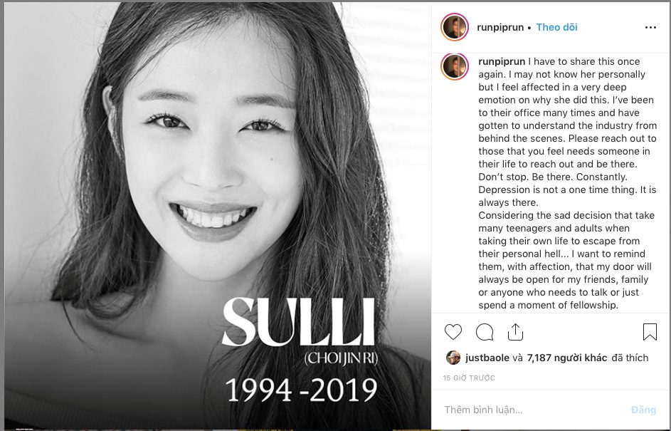 Anh viết trên trang cá nhân: “I have to share this once again. I may not know her personally but I feel affected in a very deep emotion on why she did this. I’ve been to their office many times and have gotten to understand the industry from behind the scenes. Please reach out to those that you feel needs someone in their life to reach out and be there. Don’t stop. Be there. Constantly. Depression is not a one time thing. It is always there.