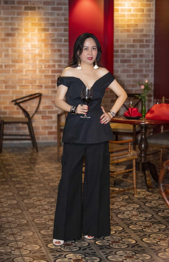 Phượng Chanel diện bộ đồ tông đen với áo khoét vai cùng quần ống suông thời trang.