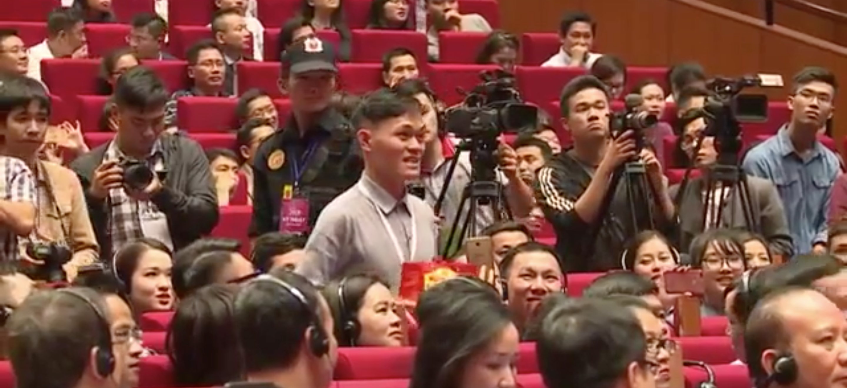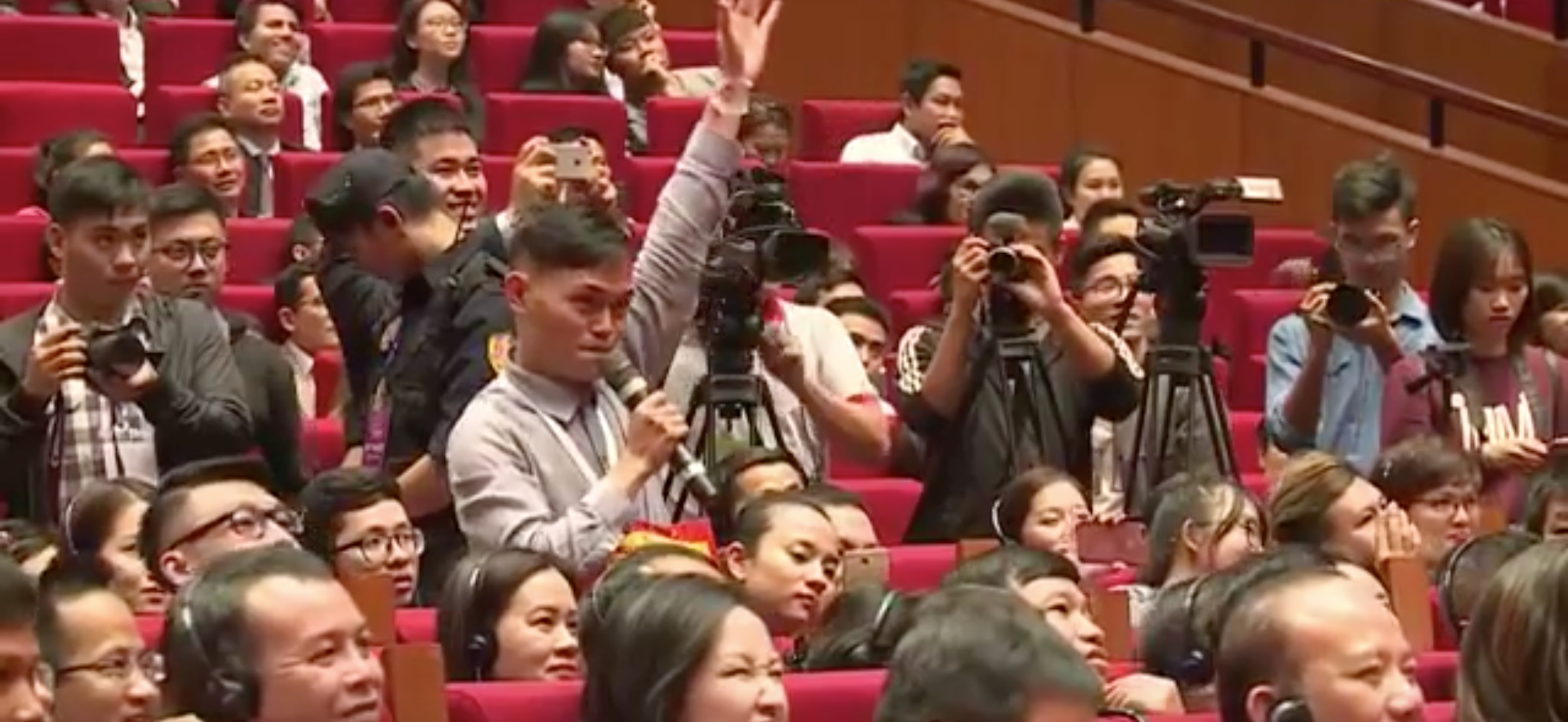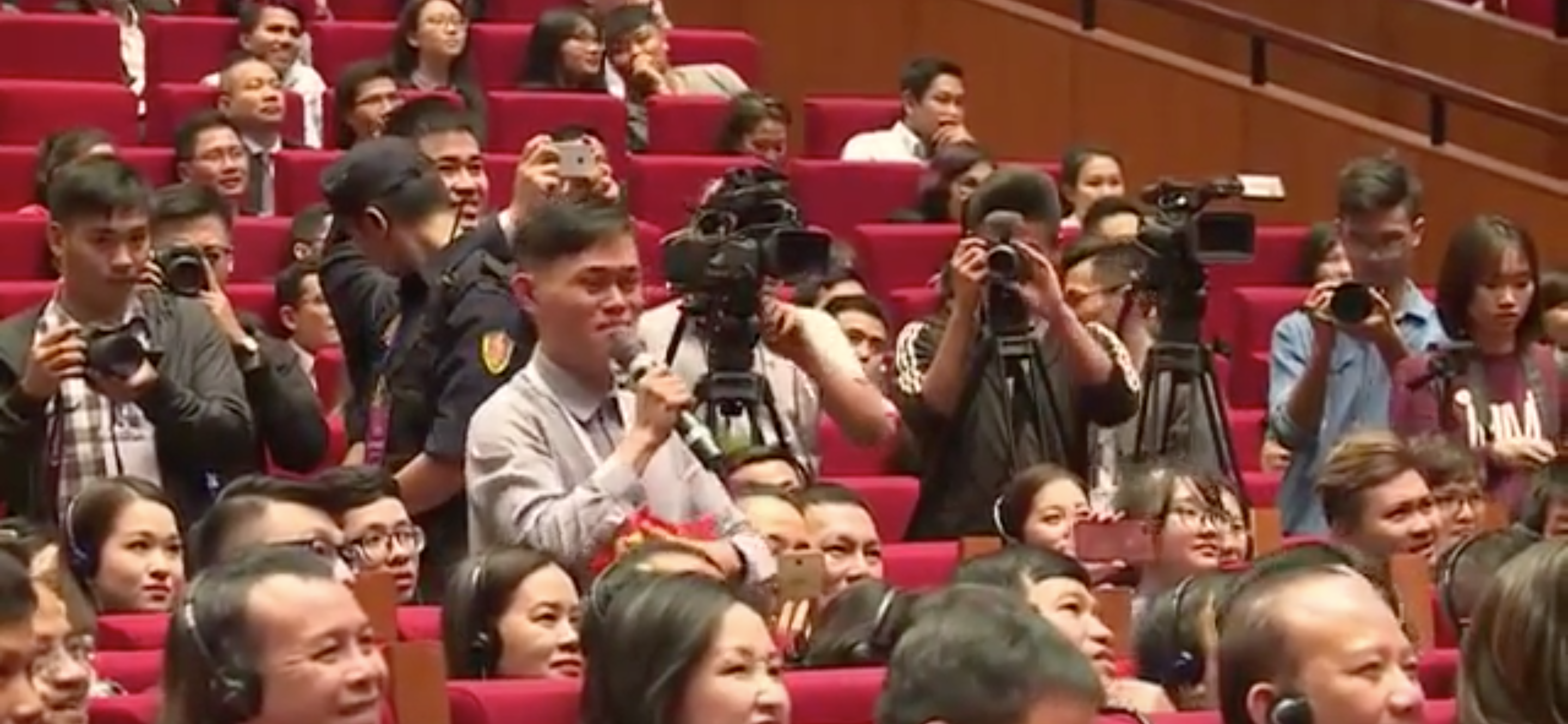 Cuối cùng, sau gần 1 giờ đồng hồ chờ đợi và nỗ lực vẫy tay không ngừng, người thanh niên lạ mặt đã được chủ tịch FPT Trương Gia Bình gọi tên. Cả hội trường chờ đợi một câu hỏi đắt giá từ anh, nhưng thay vì điều đó, anh đã hô vang “I love Jack Ma” sau hai lần nói sai “We are Jack Ma” và “We love Jack Ma.”