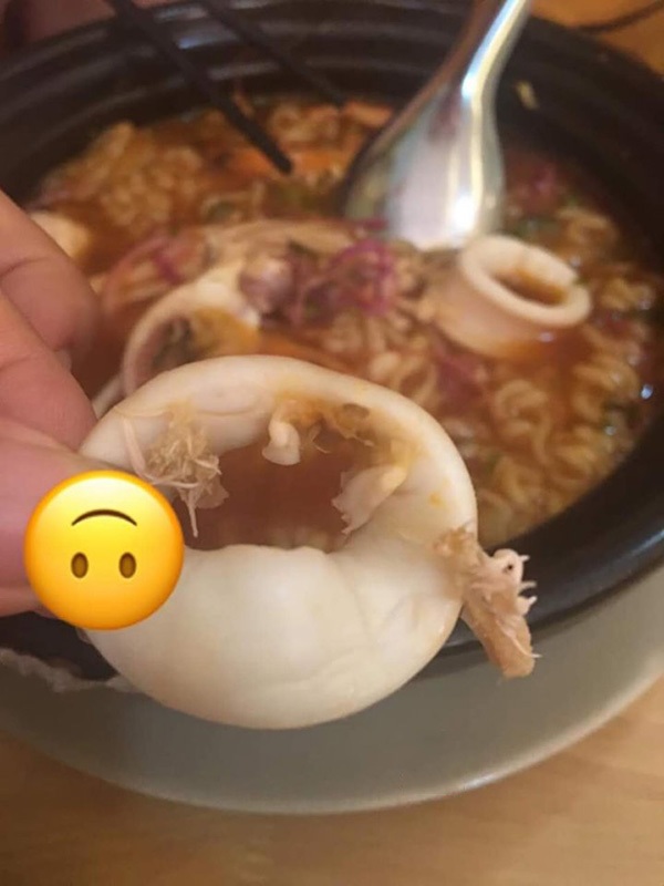 Theo chủ nhân của bài đăng, quán mì S.S xảy ra sự việc nói trên là chi nhánh Phạm Tuấn Tài (Hà Nội). Khi thắc mắc với nhân viên quán mỳ cay vì phát hiện mực có vấn đề, vị khách này nhận được câu trả lời đây là ruột mực.